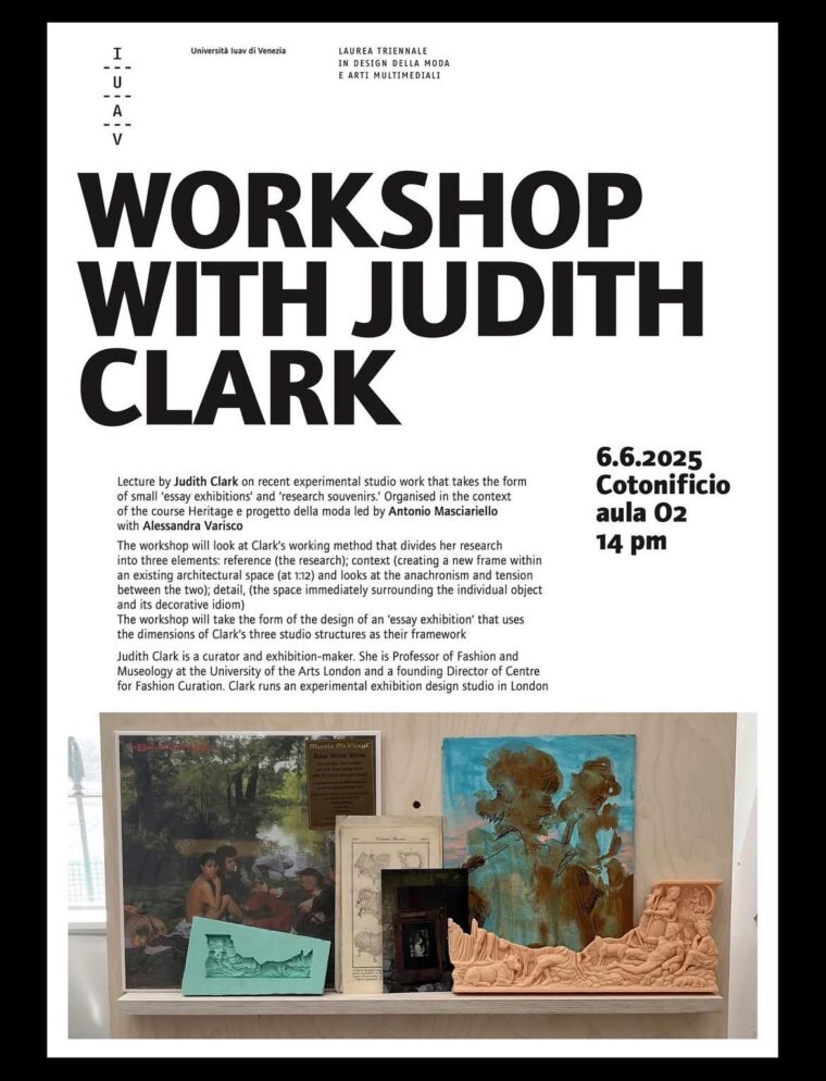 Lecture by Judith Clark on recent experimental studio work that takes the form of small 'essay exhibitions' and 'research souveniers'. Organised in the context of the cource Heritage e progetto de la moda led by Antonio Masciarello with Alessandro Varisco. June 6 2025 Cotonificio aula 02, 2pm